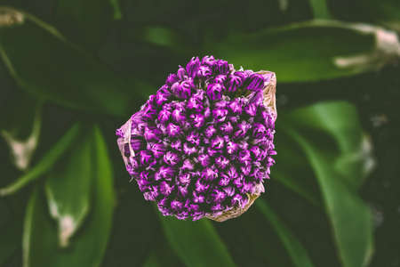 Its early spring and this giant onion plant is near bloom. A view from above as it blooms. Allium giganteum Regel