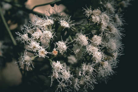 white flowers on a dark background, summer gloomy vegetable background with soft camera focus