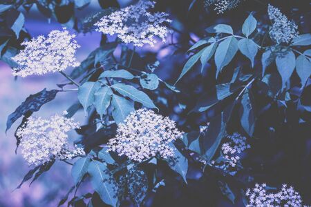 Branch of blossoming elder (Sambucus) against the sky. Vintage color. Nature background. Elderberry bush