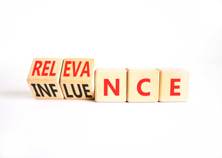 Influence or relevance symbol. Concept words Relevance to Influence on beautiful wooden cubes. Beautiful white table white background. Business and influence or relevance concept. Copy space.