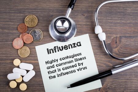 Influenza. Workplace of a doctor. Stethoscope on wooden desk background.