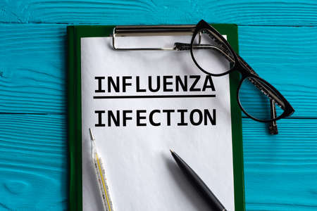 INFLUENZA INFECTION - words in a notepad on a blue background with a pen, glasses and a thermometer. Medical concept