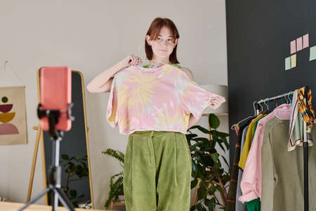 Teenage girl trying on clothes for her blog and telling about style to her followers online standing in her room
