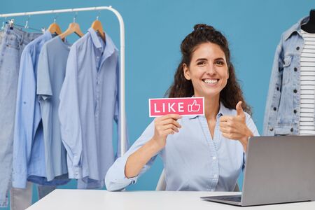 Portrait of young businesswoman sitting at the table in front of laptop and showing thumb up in the shop