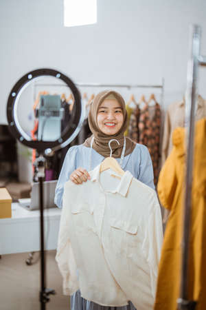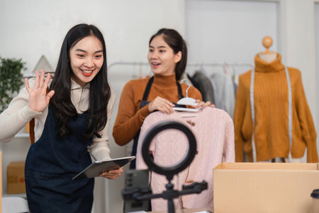 Happy Asian young woman making a live streaming video on social media to sell a beautiful female clothes and lifestyle gadgets. Asian female online merchant streaming a video for sale a clothes online