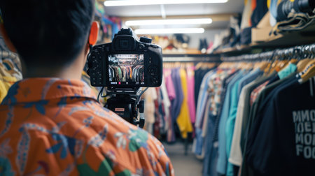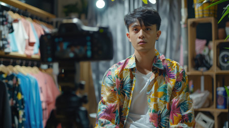 Young entrepreneur showcasing shirt in front of camera for an online sales event or live streaming.