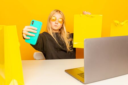 Young girl selling clothes online by live streaming from mobile phone.