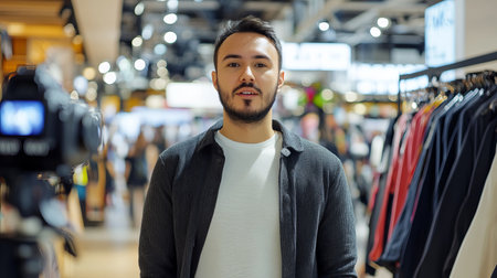 A young man engages with his audience while streaming live from a bustling shopping center. He promotes various online products, showcasing the blend of digital influence and retail experience.