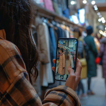Person interacts with a smartphone app to explore an online store while enjoying a contemporary shopping atmosphere filled with stylish displays