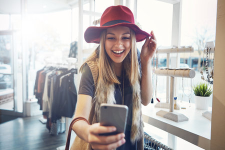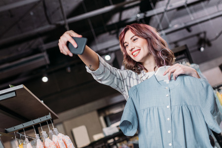 hipster girl smiling and taking selfie in boutique, clothes shopping concept