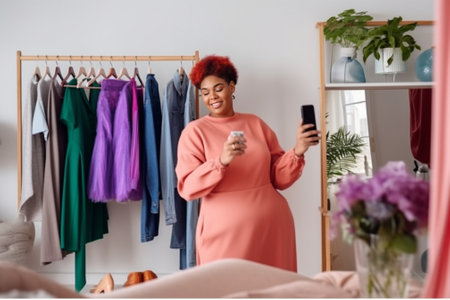A young woman styles trendy outfits and captures the moment on her smartphone, banner
