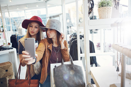 Damn, we look good. two young girlfriends snapping selfies while out on a shopping spree.