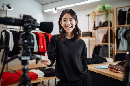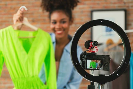 Woman influencer shoot live streaming vlog video review clothes crucial social media or blog. Happy young girl with apparel studio lighting for marketing recording session broadcasting online.