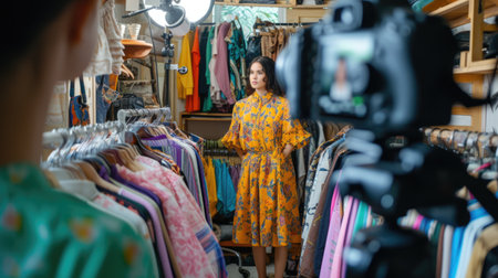 Woman photographing colorful dresses in a retail store. Fashion, style, and shopping.