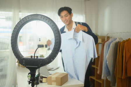 Asian man video live streaming sell shirt e commerce store or blogger live broadcasting selling shirt by smartphone and sharing on social media by at home