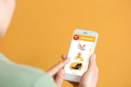Young woman holding mobile phone with open page of online shoe store on screen against color background