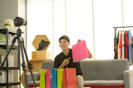 Young attractive Asian man blogger or vlogger looking at camera reviewing product. Modern businessman using social media for marketing. Business online influencer on social media concept.