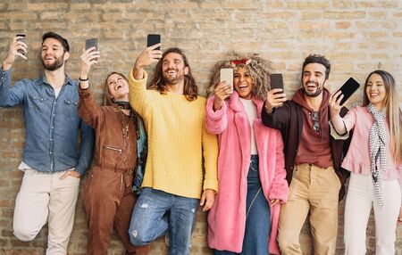 Happy group friends taking selfie with cell phone outdoor - Young trendy people having fun with new mobile smartphone apps for social media - Youth culture millennial generation and Technology concept