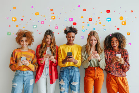 A diverse group of young adults use their smartphones while standing in front of a colorful wall.