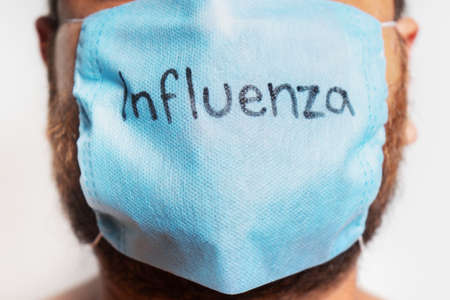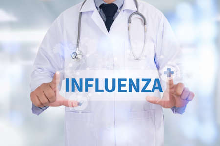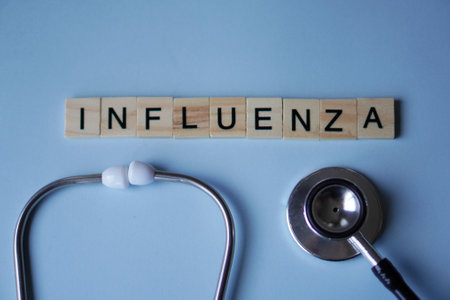INFLUENZA, wooden letters and stethoscope with a soft blue background