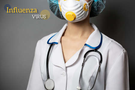 Influenza risk. Doctor wears a protective respiratory mask, medical coat and blue rubber gloves close up on a gray background. The concept of Epidemic virus medical laboratory research.