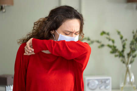 sick Asian woman suffering from covid 19 virus hand holding paper tissue and sneezing or coughing with viruses spreading in background