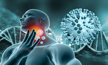 3D render of a medical background with male figure holding throat in pain with flu virus cells