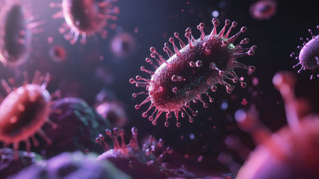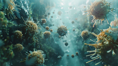 A close-up of a microscopic view of viruses and bacteria, showing their intricate shapes and structures against a dark background