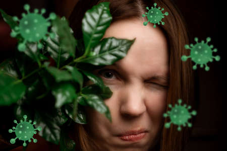 Woman with a plant near her face and virus molecules around. Without fear of infection, a woman buys plants for gardening.