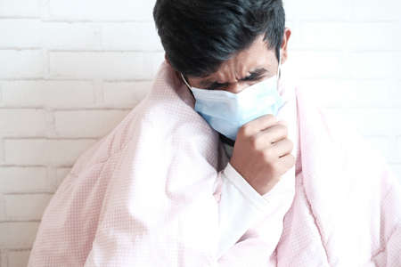 Sick man wearing mask show thermometer high temperature feeling headache on white background