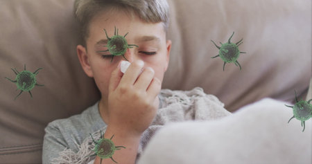 Image of virus cells over caucasian boy sneezing in bed. school and education during covid 19 pandemic concept digitally generated image.
