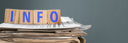Newspapers on wooden cubes with INFO written on them, studio background, stock photo