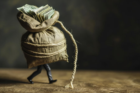 A bag full of money is securely fastened to a string, ensuring its safety during transport or storage, A human figure struggling to carry a bag full of money, symbolizing inflation, AI Generated