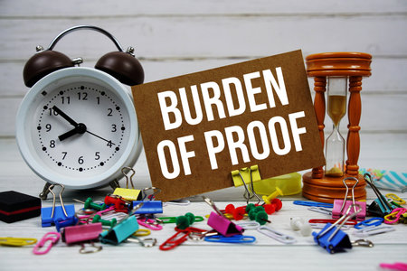 Burden Of Proof text on paper card with alarm clock and stationary on wooden background