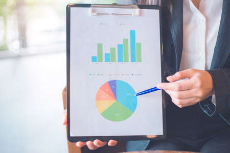 Business woman hand work on charts and graphs that show results.She uses the pen to point to the graph.