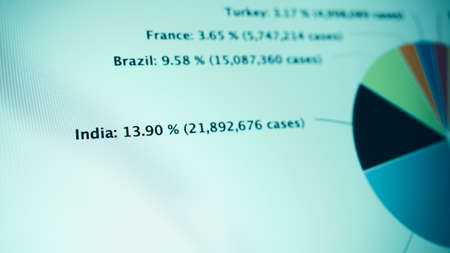 Coronavirus pandemic statistics on screen. Number of Covid 19 cases rising. Map data showing increasing numbers of Corona virus pandemic infected cases. international statistics. Health care concept.