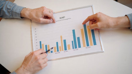 Hands discussing financial data with a bar chart infographic, showcasing collaboration in analysis.