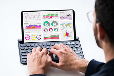 Financial Analyst Using Convertible Laptop Screen With Graphs
