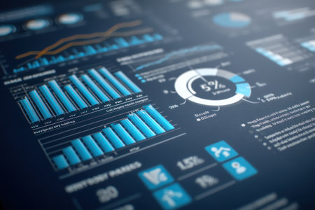 This image presents data visualizations featuring blue charts, graphs, and diagrams on a digital interface. The composition uses an overhead perspective and soft lighting to highlight the details. Suitable for commercial applications, the image can be used for presentations and illustrative purposes related to business.
