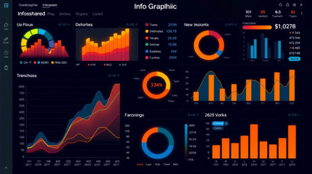 Infographic dashboard interface. Graphic design with data, graph, chart and diagram. Modern Ui and UX template for web, admin panel. Vector illustration.