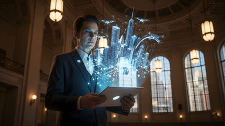 A man in a suit looks at a tablet displaying a holographic city with drones flying around it.
