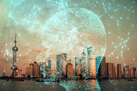 Multi exposure of social network theme drawing and cityscape background. Concept of people connecton.