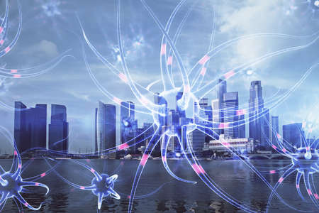 Double exposure of neuron drawing icon and cityscape background. Concept of education.