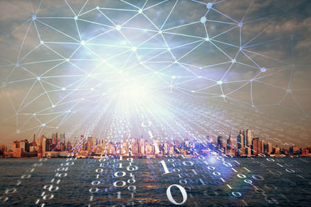 Abstract virtual coding illustration on New York cityscape background, software development concept. Multiexposure
