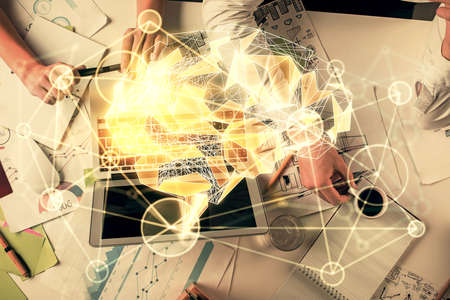 Business people work together in office with internet network effects. Concept of teamwork and partnership. double exposure