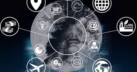 Image of network of digital icons and connections over spinning globe. Global connections, digital world and digital interface concept digitally generated image.