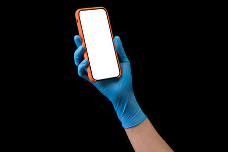 Doctor's hand in sterile medical gloves holding phone isolated on black background . Concept of protection against pandemic and viruses.