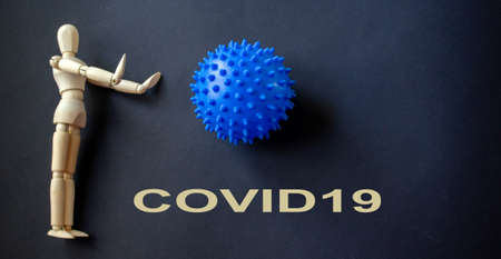 Pandemic Coronavirus concept Wooden model of a man standing in front of a coronavirus model. Inscription covid19.