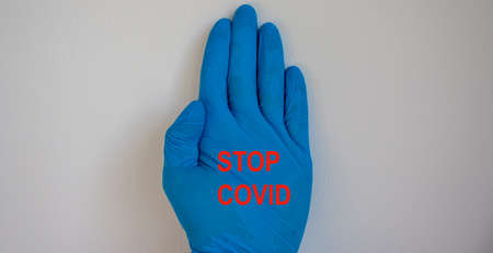 Doctor hand in sterile blue gloves. Stop covid inscription.