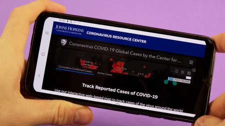 Moscow, Russia- February 22, 2020 coronavirus statistics on the phone in the hands of a man.